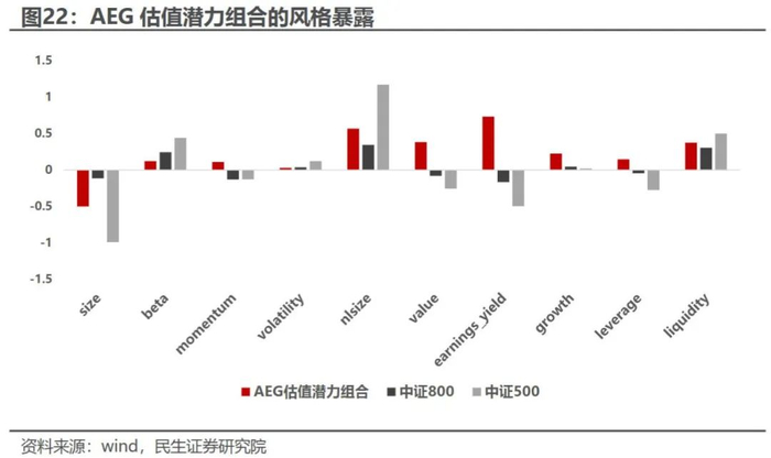 AEG估值潜力组合的风格归因结果显示,该组合偏好中盘偏大的价值型股票(由于等权持有,较市值加权的中证800市值暴露更低),具有较低的市场波动性和风险敞口。组合表现出对高盈利收益率和价值因子的显著正向暴露,显示出其专注于寻找市场上被低估的股票。同时,组合在成长性上也有适度的暴露,这主要是由于在计算AEG是用到了分析师一致预测的净利润同比数据。