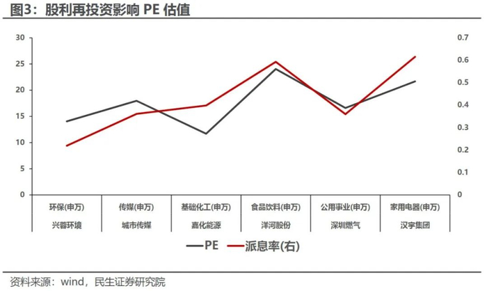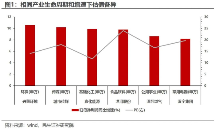 为了尽量避免产业生命周期不同造成的预期增速等影响,我们这里选取了同处于成熟期行业的几个例子以说明问题:下图列举的6家公司分别属于环保、传媒、基础化工、食品饮料、公用事业和家用电器等成熟行业,因此长期预期增速和市场空间相对差距并不大,也并不是传统的“估值陷阱”行业。