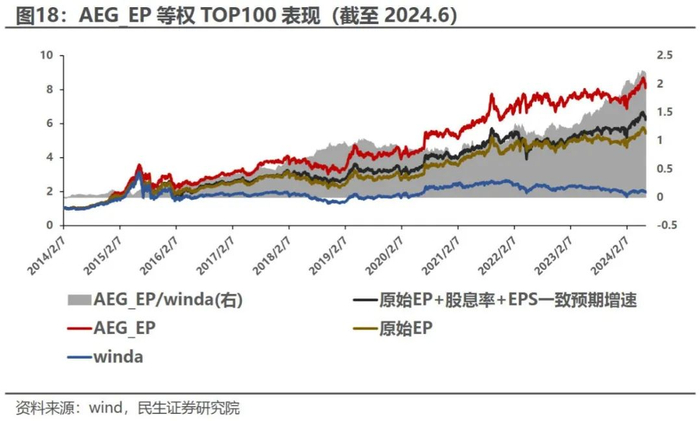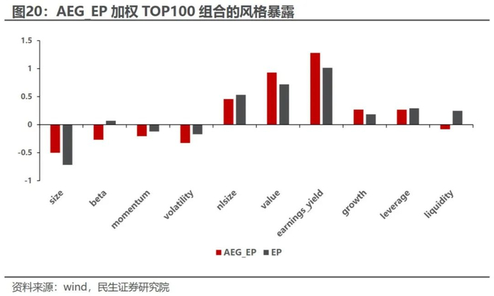 从行业分布上看,AEG_EP下的TOP100组合与原始EP因子下的TOP100组合较为接近,但在银行、机械、电力设备及新能源等行业配置相对更多,在房地产、交运等行业配置相对较少,这与预期增速变化和行业派息程度有一定关系。
