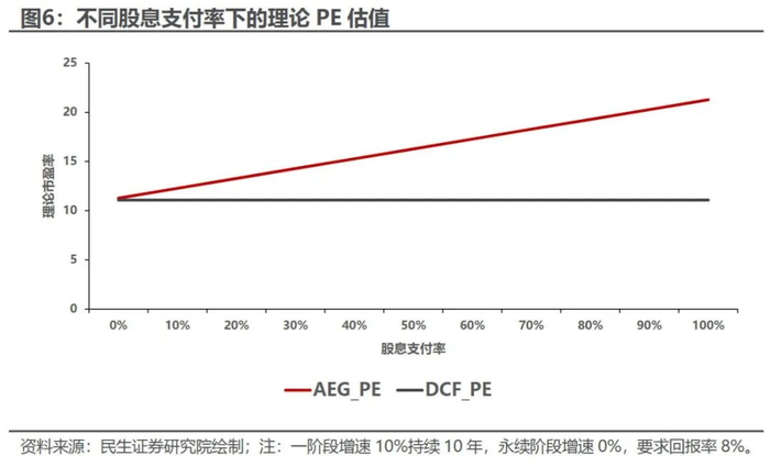 当股息发放的程度越高时,AEG下的理论估值与DCF下的理论估值差距越大。背后的原因在于派息率越高,则忽略掉的股利再投资部分越大,导致了收益的有偏估计。