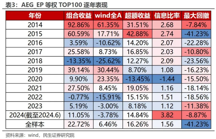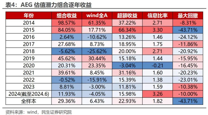AEG估值潜力组合在近十年内实现近30%的年化收益,相对于wind全A年化超额收益达22.93%。在过去的十年中,除“抱团股”强势的2022年跑输基准外,其余年份均稳定跑赢基准。