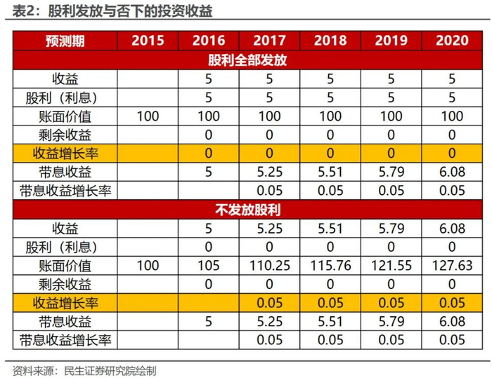 下表展示了一个例子。有两家公司,期初的账面净资产和收益(EPS)都是相等的,区别在于:一家公司股利是全部发放的,因此没有任何的留存收益进行再投资,使得每一期的EPS都没有增长;另外一家公司股利是完全不发的,因此每期能按照5%的无风险利率进行增长。