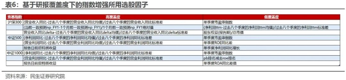 我们在之前的报告《寻觅无人之境:基于研报覆盖度调整的指数增强》中,我们提出来通过研报覆盖度分域增强的思想,构建了沪深300、中证500和中证1000指数增强三个组合。这三个组合中,均用到了EP因子。具体选用因子如下: