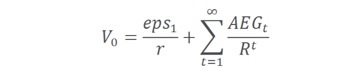 AEG等于带息收益与正常收益的差额。第一年的预测收益与以后各年度超额收益增长的现值相加,得到的总额资本化后就是权益价值。