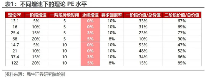 高PE的公司,估值的贡献主要源自于远期的增速假设。上表展示了不同增速、持续时间以及要求回报率下的理论估值,可以发现,高市盈率(PE)很大程度上来自远期的永续增速假设,此时估值的重点在远期的增速。