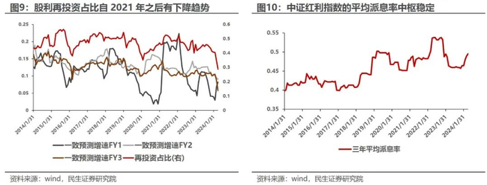 带息收益=EPS+股利再投资,中证红利指数的股利再投资占带息收益的权重近些年有所降低,其背后的原因在于再投资效率的降低。在2021年之前,中证红利指数的股利再投资占比大致在50%附近,在2021年之后,开始出现下降的趋势。这种趋势的下降究其原因在于分析师一致预测增速下滑传递出再投资效率的降低。