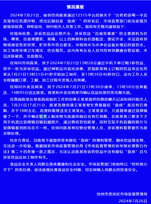 7月26日,针对有市民反映“古茗奶茶中疑有‘血痰’”一事,安徽池州市贵池区市场监督管理局发布情况通报称,经多方查证,无法认定陈某所诉的饮品中含有疑似“血痰”且与涉诉饮品店加工制作有关。