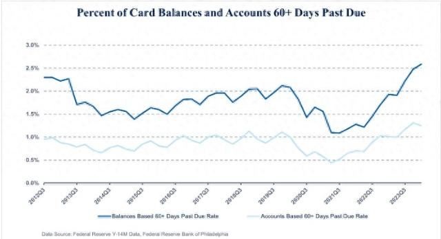 费城联储7月24日发布的2024年一季度银行贷款和抵押贷款报告显示,美国第一季度的信用卡拖欠率升至2012年美联储开始跟踪该数据以来的最高水平。