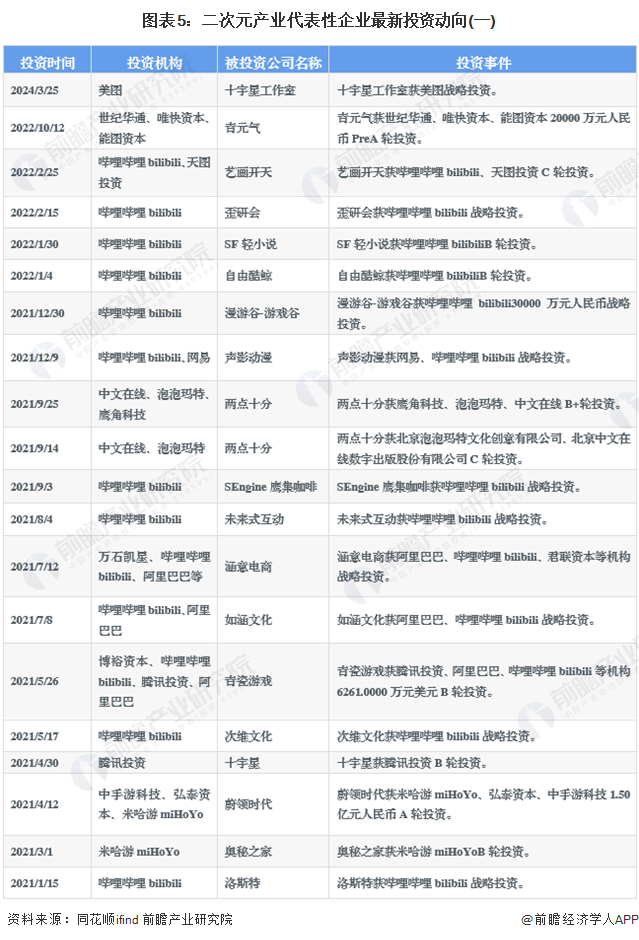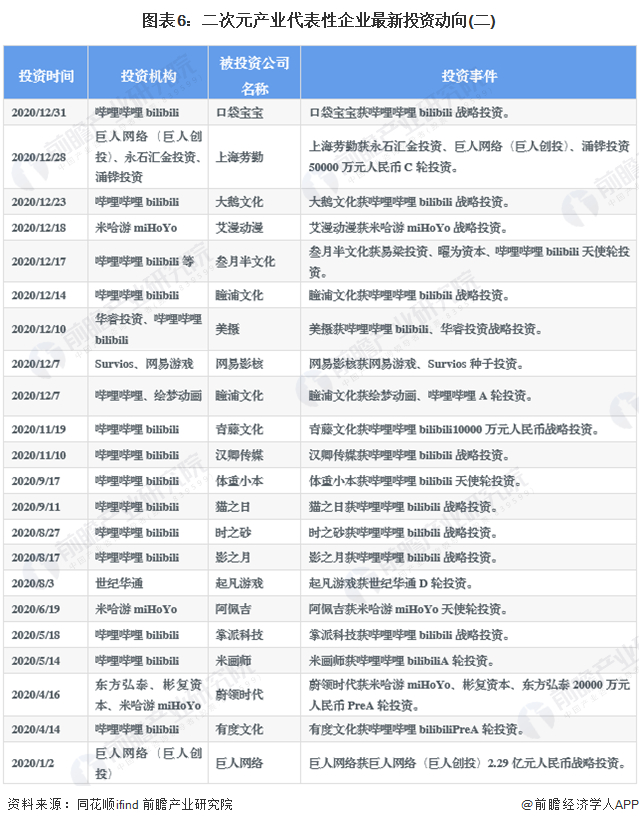 2020年以来,二次元产业代表性企业的投资动向主要包括收购公司拓展业务、通过对子公司增资的方式投资新项目/新IP等,具体代表性投资事件汇总如下: