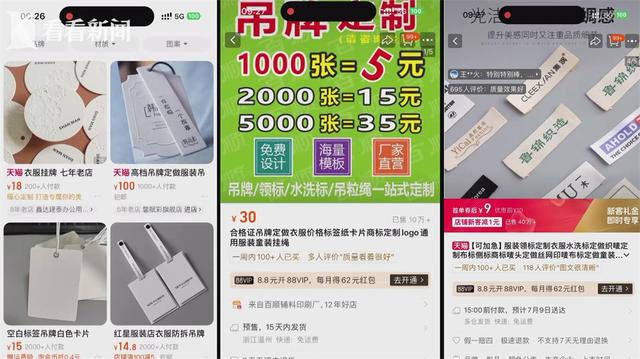 直播间的负责人介绍,二手衣物的二次销售行业中,不乏很多以次充好,将旧衣服挂上定制吊牌,假冒尾货来高价出售的,也曾被媒体不止一次曝光。快手、抖音等平台还一度因此关闭了这类直播,在网上,输入“吊牌定制”,有大量店铺都能提供这类服务,1000张吊牌才5块钱。“很多人不诚信,很多人消费者也看不出有穿着的痕迹,明明是二手衣服,但经营者却买些吊牌挂上面,所以说,这些人把我们这个行业搞得有点不太好。”