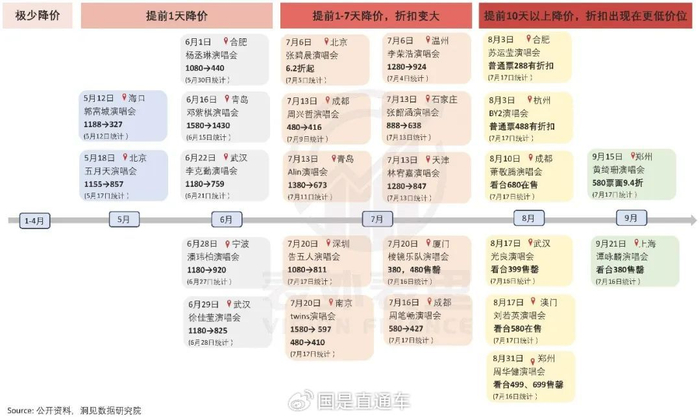 个人演唱会也没能挺住,不少8—9月的演唱会现在就开始降价促销,而7月只会提前几天打折,5—6月则只能在开唱前1天蹲到特价票,如今不仅折扣越打越狠,波及的歌手名单也逐渐拉长。