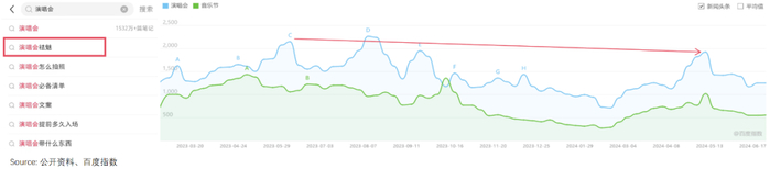 在社交平台上,“祛魅”成为了演唱会排在前列的搜索联想词。搜索平台的数据也显示,演唱会、音乐节的搜索指数,今年出现了一定程度的回落。