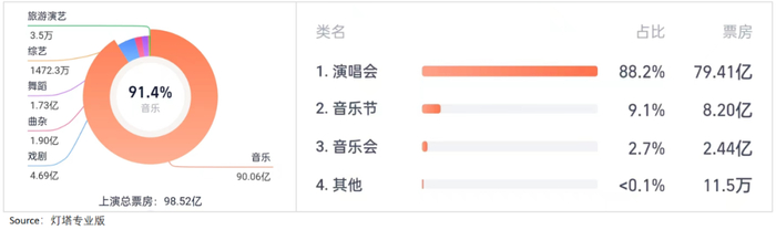 一路高歌猛进之下,国内演出经济再创新高,据行业协会数据,2024年上半年,演唱会、音乐节票房收入同比增长134%;而灯塔专业版数据显示,截至7月17日,演唱会、音乐节分走了整个音乐演出市场约90%的蛋糕。