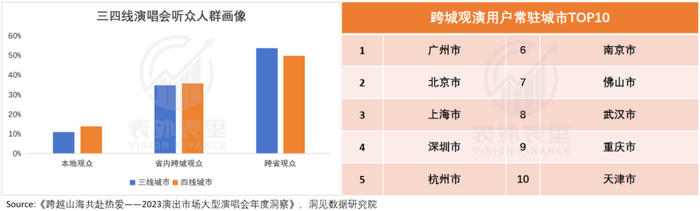 演唱会的下沉,既有地方文旅部门的推波助澜,也离不开一二线年轻人的捧场——2023年,三四线城市演唱会本地观众不到15%,近半数都是跨省观众;而跨城观演用户常驻城市Top10,清一色是国内一二线大城市。
