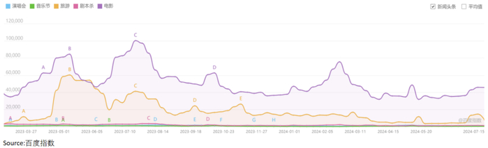 事实上,降温的不止是音乐演出,搜索指数显示,旅游、电影、剧本杀等年轻热衷的娱乐项目,去年热点接二连三,今年整体都趋于平淡了。