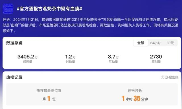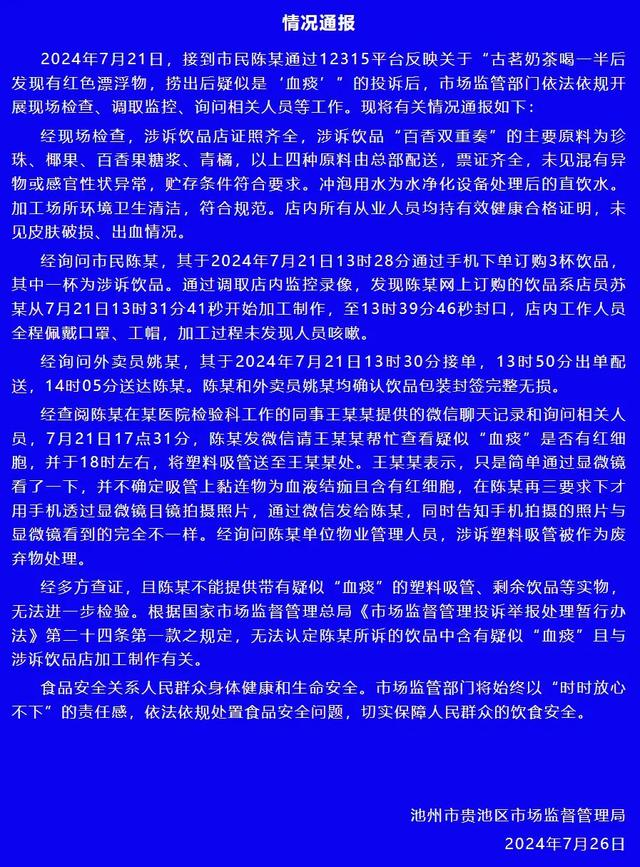 2024年7月21日,接到市民陈某通过12315平台反映关于“古茗奶茶喝一半后发现有红色漂浮物,捞出后疑似是'血痰'”的投诉后,市场监管部门依法依规开展现场检查、调取监控、询问相关人员等工作。
