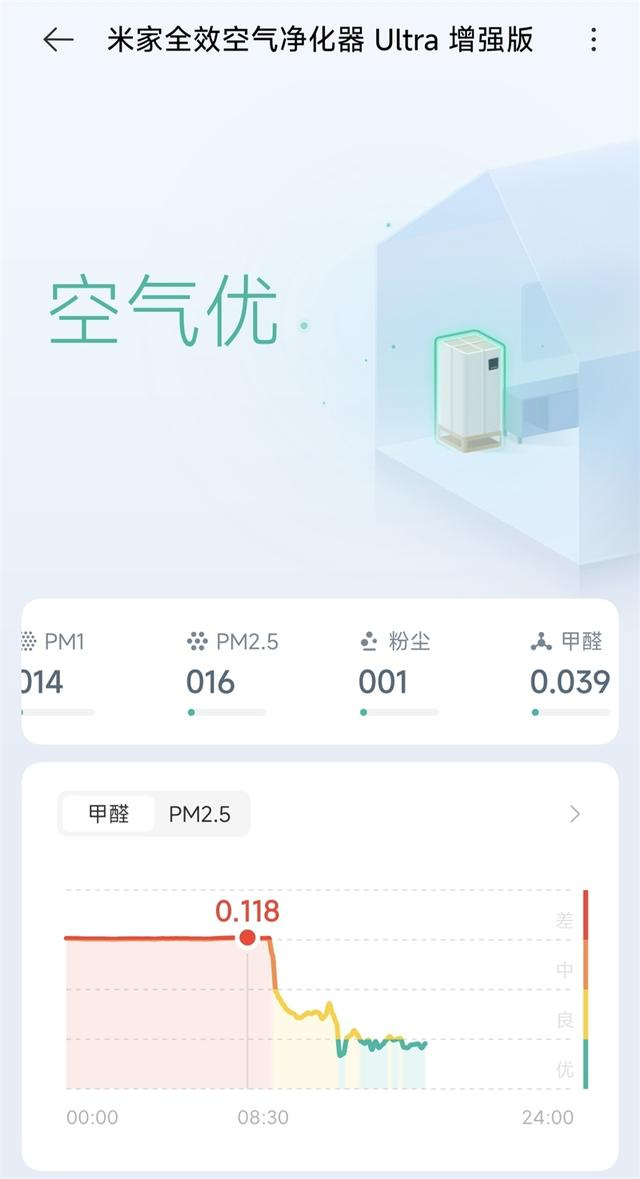 白天打开门窗口,配合米家全效空气净化器 Ultra 增强版进行净化,大约一个小时后,甲醛浓度就从最高0.118mg/m3,降到了0.066mg/m3,持续工作到中午,浓度就已经掉至0.039mg/m3了,空气质量已经达到了优秀的水平。