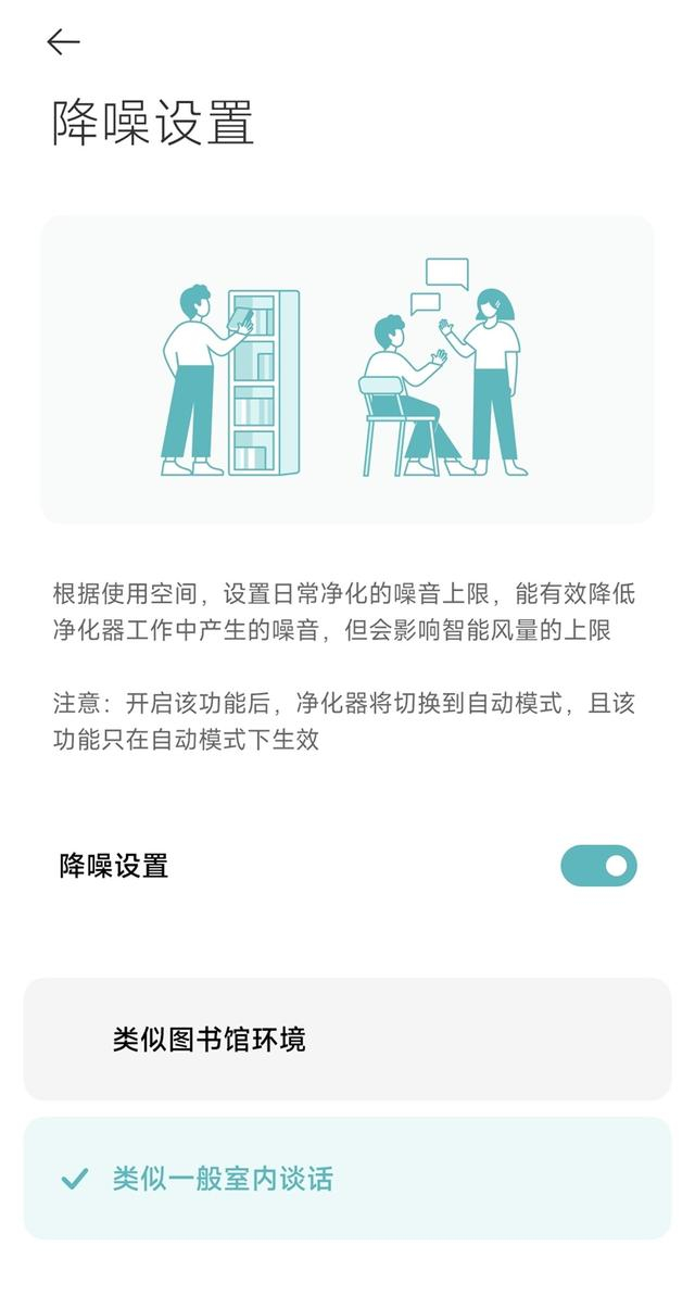 如果你想要净化器在自动模式下运行,但又怕空气不好时全速运转会影响交流、睡眠,则可以在降噪设置中更改噪音上限,能够有效降低工作中产生的噪音。