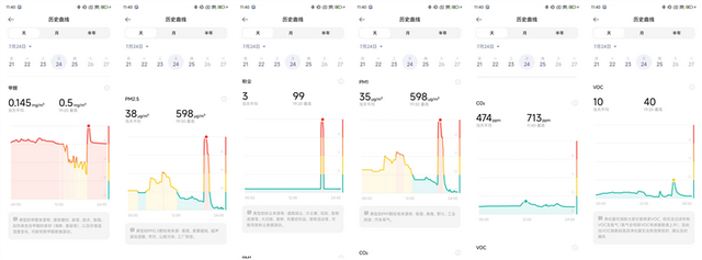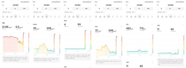 此时室内环境各项数据都已经达到了较差的级别,PM2.5和PM1的数值飙升至每立方米598μg、二氧化碳浓度升至713ppm、甲醛浓度为0.5mg/m3、VOC指数为40、粉尘指数为99。