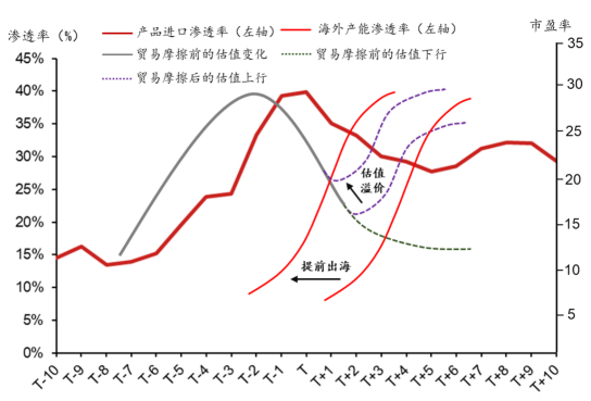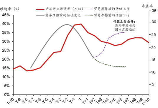 2)而渗透率突破30%后,由于存在贸易摩擦发生的可能性,估值触顶回落,而一旦发生贸易摩擦,估值将会持续下行;