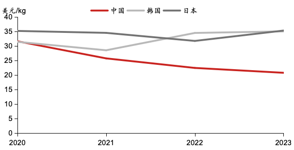 ▲图表17:2020-2023年中日韩电池对美国出口价格对比