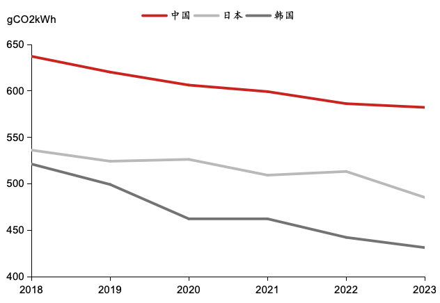 ▲图表14:2018-2023年中日韩电力碳排放比较