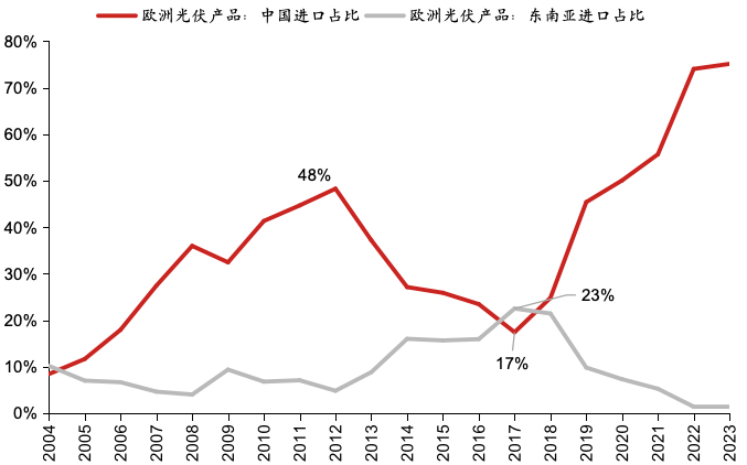 2017年,随着欧洲进口中国光伏产品的份额降至17%,2018年后欧盟委员会决定不再延长对中国光伏组件的双反措施。在贸易壁垒消失后,中国对欧洲出口恢复成长性,2023年欧洲光伏组件进口产品中国份额提升至75%,而东南亚对欧洲出口比例则相应出现明显下降(2023年占比1%)。