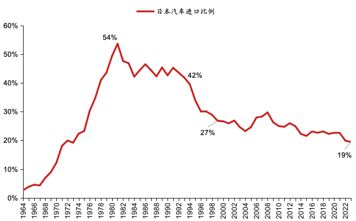 基于保护国内汽车产业及维持对外贸易平衡的考虑,1980年起美国对日本汽车业出口的贸易摩擦逐渐加剧,并于1981年达成《自愿出口限制协议》。后续经过多次谈判,美国逐步提高日本汽车自愿出口限制标准(从168万辆到230万辆)直至1994年完全取消。从进口数据来看,1981年起,日本在美国汽车进口中占比经历长期明显的下滑。据美国国际贸易委员会数据,1981-1993年美国进口汽车中,日本占比由54%下滑至42%(按金额计)。
