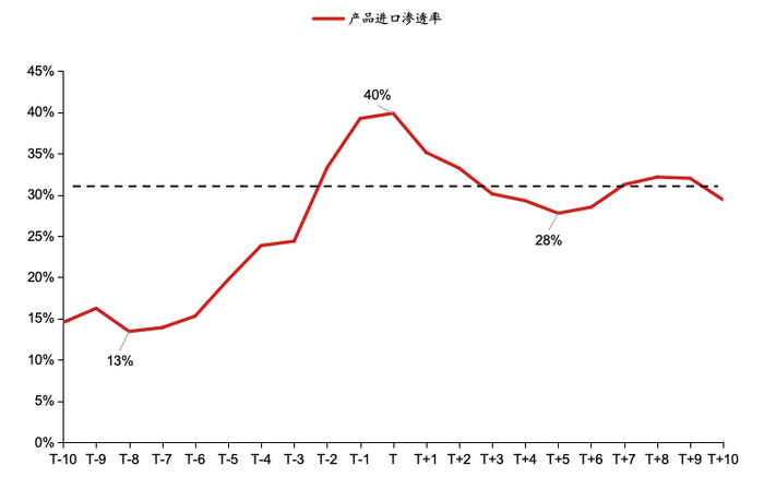 根据该曲线所示,当出口国产品在T-7年具备出口优势,开始进行产品加速出海后,大约用7年的时间,在主要进口国的渗透率占比从13%提升至40%。而在40%的T时刻,往往容易遭遇各类型的贸易摩擦,比如反倾销、反补贴、限制进入等形式,而大约经历5年的时间,进口渗透率的水平将下滑至28%的水平。此后,或因产能出海、贸易壁垒降低等影响,渗透率在30%左右波动。