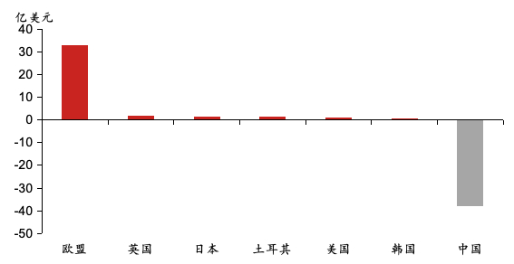 欧盟贸易摩擦或将带来进口显著下降。据德国基尔世界经济研究所测算,对中国电动车加征20%关税将导致欧盟从中国进口电动车数量下降约25%,对应贸易金额为38亿美元。与之对应的是,欧盟内部生产的电动车销售金额有望增加约33亿美元,其余英国、美国、日本等欧盟其余贸易国也将不同程度受益。