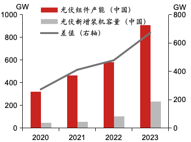 ▲图表10:2020-2023年中国光伏产能与装机量对比