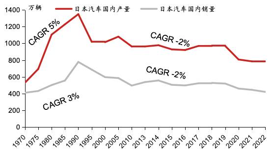 ▲图表6:1970-2022年日本汽车国内产销量情况