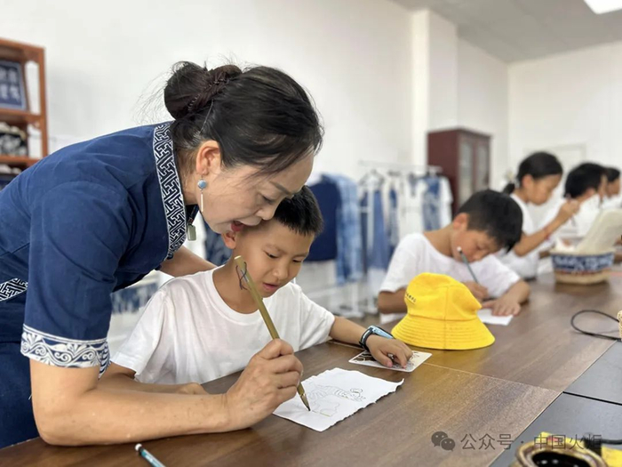 7月25日,贵州省黔南州惠水县关工委组织岗度26°C温韾港湾的50名青少年到非遗文化研学基地学习“枫香染”绘画、染料、制作等工艺。