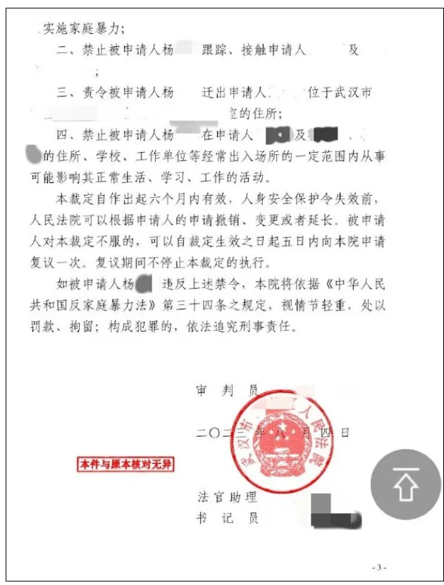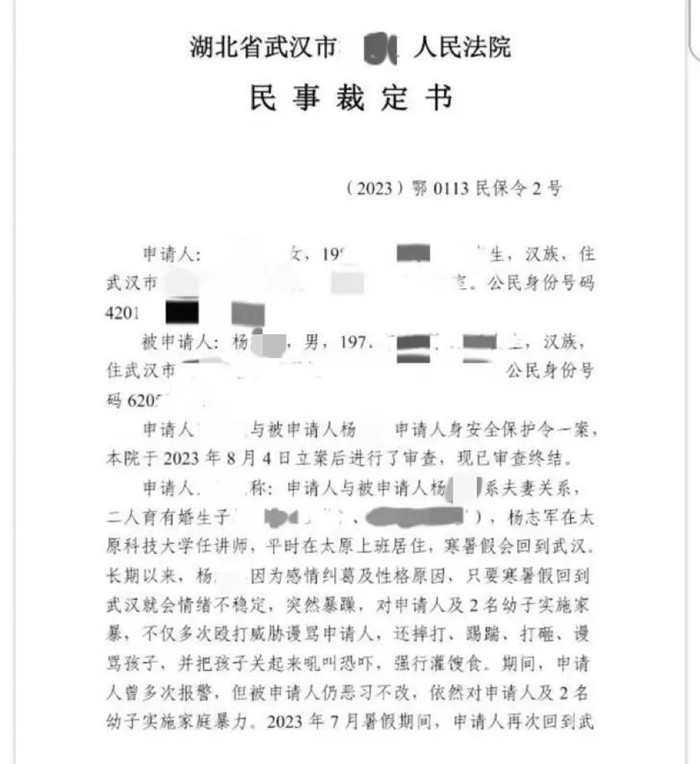 湖北省武汉市人民法院于2023年8月作出的民事裁定书显示:本院结合申请人(杨某某妻子)提交的证据和本院调查情况,可证实申请人及其幼子曾遭受家庭暴力,并正在面临家庭暴力现实危险处于不安定状态中。裁定禁止杨某某对申请人实施家庭暴力、跟踪接触申请人,禁止出入申请人住所、学校、工作单位等。