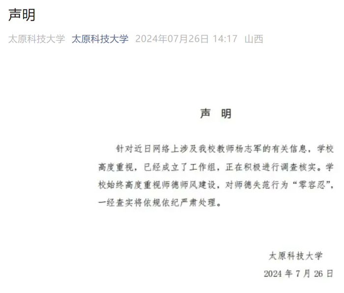 针对近日网络上涉及我校教师杨志军的有关信息,学校高度重视,已经成立了工作组,正在积极进行调查核实。学校始终高度重视师德师风建设,对师德失范行为“零容忍”,一经查实将依规依纪严肃处理。