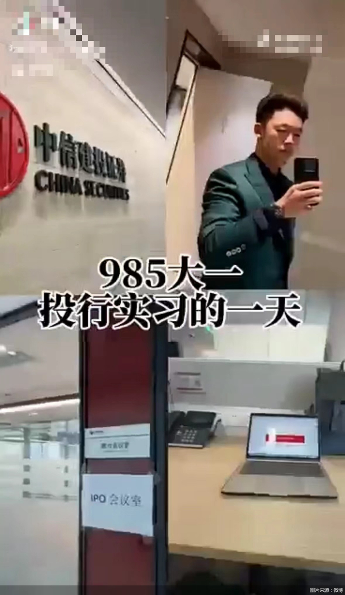 7月26日,北京商报记者关注到,题为“985大一投行实习的一天”的视频在网上流传。视频内容是一名男子在中信建投证券投行部实习,上午10点打卡上班,下班不用加班的日常。视频中,该实习生开豪车、戴名表、下班打高尔夫等“操作”,被网友视为炫富之举。