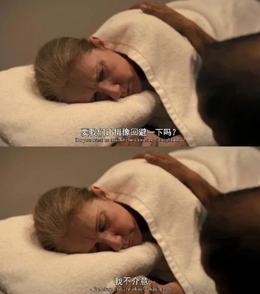 她的意识仍然清醒,示意摄像机可以继续拍摄,同时嘴里发出痛苦的哀鸣。特写镜头里,她双目圆睁,空洞地注视着前方,泪水顺着眼眶流了下来……