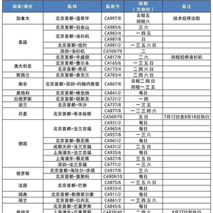 中国国航将新开北京-达卡、成都-米兰航线,恢复上海-巴塞罗那航线,加密北京-哥本哈根、成都-新加坡等13条国际航线航班。届时国航执飞的国际和地区航线将达到114条,通达六大洲43个国家及地区,并通过与星空联盟成员航空公司合作,将航线网络扩展至全球近1200个目的地。