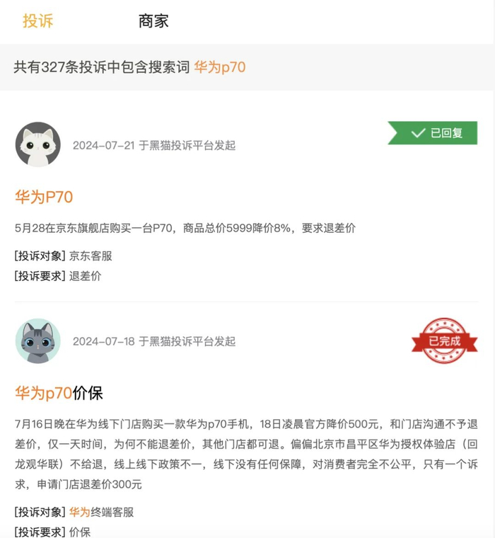 但并非所有购买Pura 70系列的消费者都如圣宇这般“幸运”地讨回差价。7月下旬,记者在社交平台上发现,不少消费者吐槽要求商家退差价惨遭拒绝的经历。新浪旗下消费者服务平台黑猫投诉最新数据显示,截至7月25下午,以“华为P70”为搜索关键字的相关投诉共有327条,其中消费者的投诉多与P70降价,要求退差价相关。