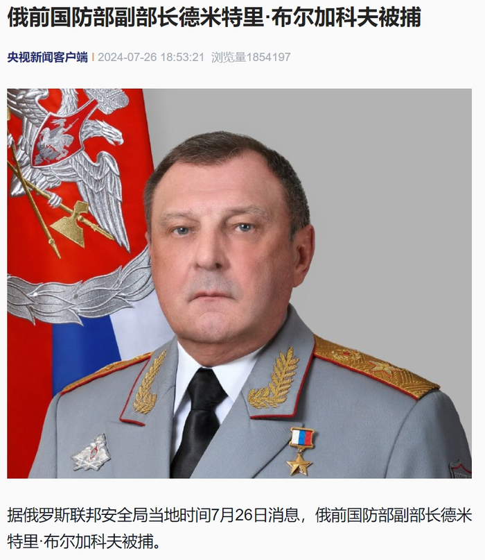 据央视新闻,据俄罗斯联邦安全局当地时间7月26日消息,俄前国防部副部长德米特里·布尔加科夫被捕。
