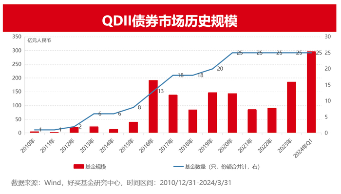 在2023年底,QDII债券基金共有25只,合计规模为185亿元。到了2024年一季度末,合计规模达到295亿元,创历史新高。2024年一季度单季新增超110亿元,也给有限的QDII基金额度带来压力。目前较多QDII债基因为额度问题出现不同程度的限购措施。