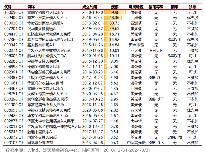 据Wind数据,截至24年一季度末,市场上共有25只QDII债基(人民币A份额计),基本信息如下表所示。