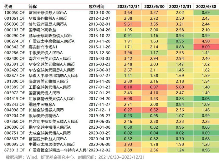 久期方面,易方达中短期美元债A人民币和鹏华全球中短债人民币A在合同方面有期限约定,其他标的并无合同方面的久期约束。