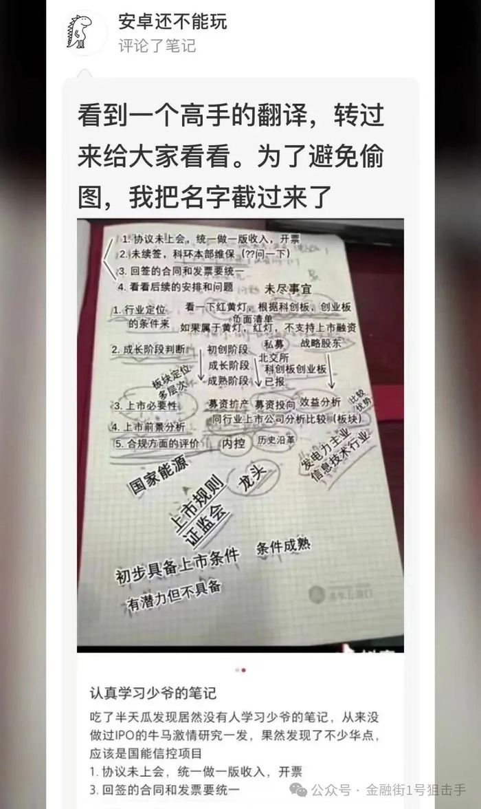 同时,细心的网络还发现,这名实习生笔记或许甚至暴露企业上市过程的财务造假过程。例如,统一做一版收入开票、回签的合同需要一致等字样。