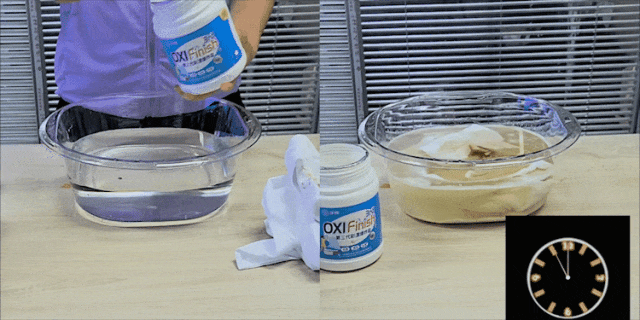 只需在爆炸盐水里泡20min左右拿出,即可见证奇迹时刻——轻轻一抹,污渍直接消失不见!