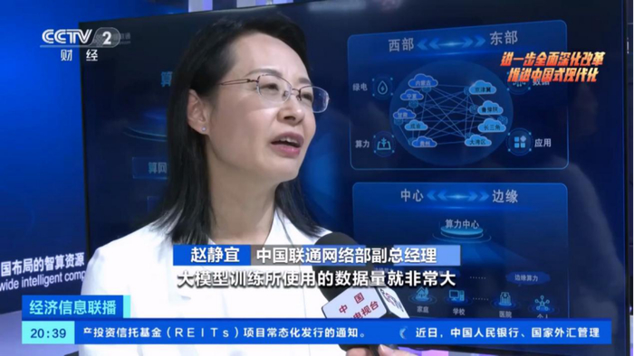 在大会现场,央视针对中国联通算力智联网进行采访。中国联通网络部副总经理赵静宜向央视记者介绍,不久前,中国联通做了从宁夏到上海3000公里的广域高通量无损测试,TB级的数据在半分钟之内可达。