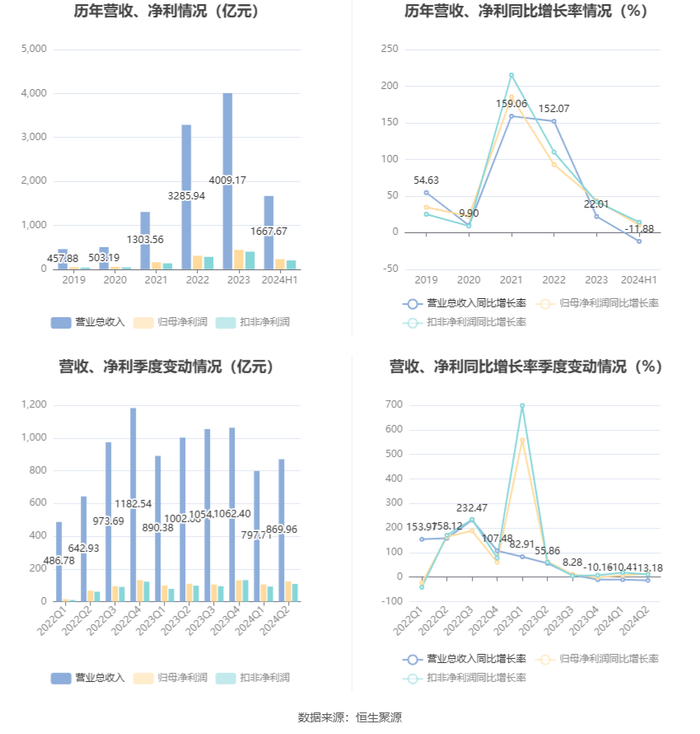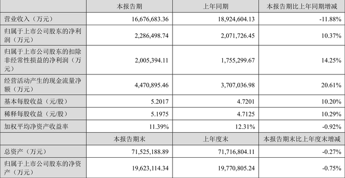 根据半年报,公司第二季度实现营业总收入869.96亿元,同比下降13.18%,环比增长9.06%;归母净利润123.55亿元,同比增长13.40%,环比增长17.56%;扣非净利润108.07亿元,同比增长10.80%,环比增长16.86%。