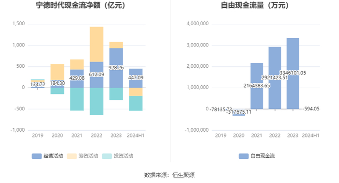 2024年上半年,公司经营活动现金流净额为447.09亿元,同比增长20.61%;筹资活动现金流净额-191.76亿元,同比减少253.62亿元;投资活动现金流净额-348.78亿元,上年同期为-121.17亿元。