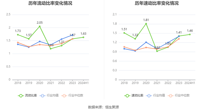 2024年上半年,公司流动比率为1.63,速动比率为1.46。