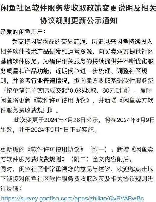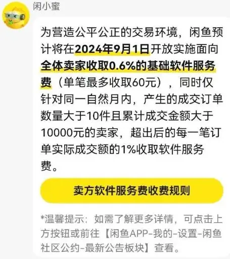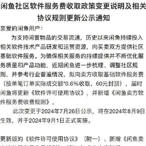 7月26日,闲鱼发布公示,宣布将面向全体卖家收取0.6%的基础软件服务费(单笔最高收取60元)。同时仅针对同一自然月内,产生的成交订单数量大于10件且累计成交金额大于10000元的卖家,超出后的每一笔订单实际成交额的1%收取软件服务费。